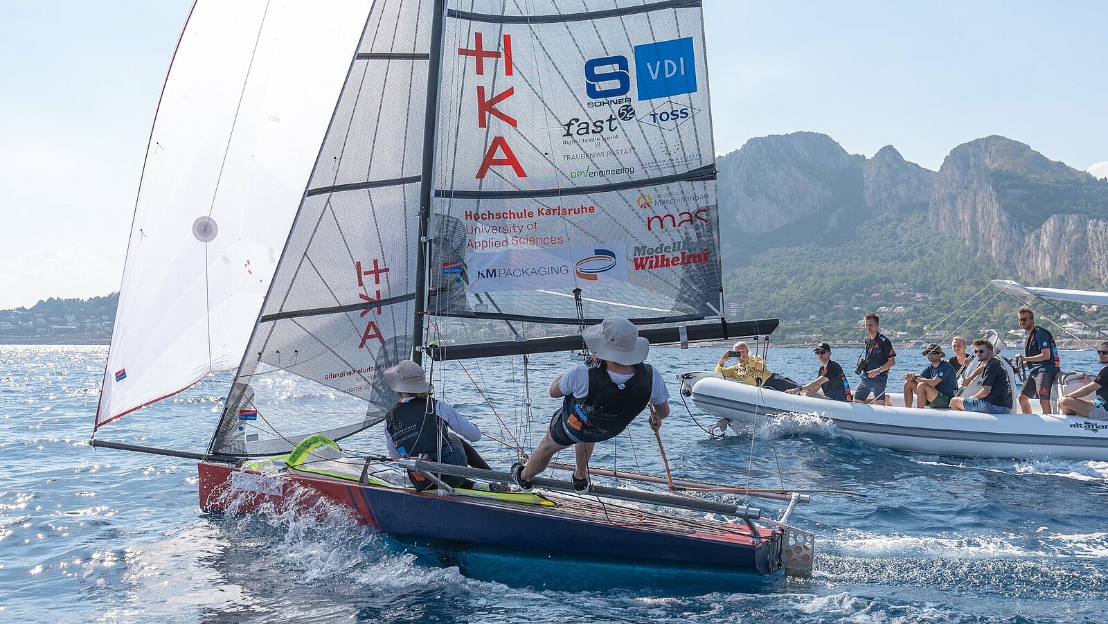 Das „HKA KM-Packaging Sailing Team“ der Hochschule Karlsruhe (Die HKA) hat vom 27.09. bis 01.10.2023 seine sechste Teilnahme mit zwei selbst entwickelten und gefertigten Segelbooten am internationalen Hochschuldesign- und Segelwettbewerb „1001VELA CUP 2023“ sehr erfolgreich absolviert. Die fünfzehnte Auflage von „1001VELA CUP Trophy“ fand dieses Jahr Ende September am Golf von Palermo (Sizilien/Italien) unter der Beteiligung von zwölf internationalen studentischen Hochschulteams statt. Beim „1001VELA CUP Trophy“ handelt es sich um einen internationalen Hochschulkonstruktions- und Segelwettbewerb, bei dem Studierende aus internationalen Hochschulen das Ziel verfolgen, ein Segelboot zu konstruieren und zu fertigen, um damit anschließend an einer dreitägigen Segelregatta an der Küste von Italien teilzunehmen und gegen andere internationale Teams anzutreten und sich zu messen. Die Segelboote müssen ausschließlich durch Studierende vollständig entwickelt und gefertigt werden. Einer der Hauptziele von „1001VELA CUP Trophy“ ist es, neue nachhaltige und umweltfreundliche Ansätze im Konstruktions- und Fertigungsbereich nach dem 3R-Konstruktionsprinzip (Reuse – Reduce – Recycle) zu entwickeln und auszuprobieren. Hierzu zählt z. B. die Hauptanforderung, dass der Rumpf aus mindestens 70 Prozent Naturmaterialien bestehen muss, die vollständig recyclebar sein sollen.